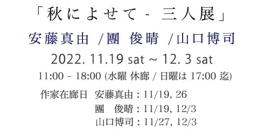 三人三様の個性溢れる油彩、アクリル、ミクストメディアの作品を展示いたします。お楽しみいただければ幸いでございます。 |